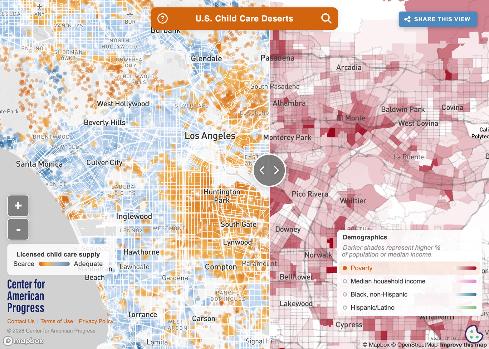 With nearly 70 percent of children under age 6 living in homes where all parents are employed, child care is widely essential, despite the well-known financial burden it poses for families.8 Leaving the workforce poses significant economic challenges for families,9 and many need two or more incomes to cover basic expenses such as housing, health care, and food, all of which have become more costly.10 Affordability remains a significant issue for families nationwide, but even with expanded subsidies that would bring the cost of child care within reach, low supply still fuels lengthy waitlists and leaves families with limited options. In 2016, the Center for American Progress defined the licensed supply shortage known as “child care deserts” as census tracts with at least 30 children age 5 or younger and either no licensed child care providers or a ratio of more than three children under age 5 for every licensed slot.11 This definition has since evolved, but the underlying impact of measuring deserts remains.12 Understanding the availability of licensed child care options is a crucial step toward addressing systemic issues in the sector that keep prices high, options for families low, and providers and educators living on subsistence wages.