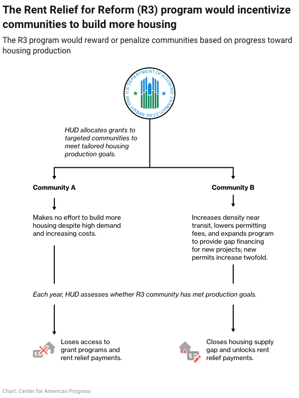 CAP is proposing the R3 program, a three-year effort to accelerate housing production and preservation and bring down the burden of rent in communities across the country. The R3 program would identify Housing Cost Crisis Zones (HCCZs)—jurisdictions across the country where rents are exceptionally high or rising rapidly and where housing supply has failed to keep pace with demand. The initiative is designed as both a “carrot” and a “stick”: In HCCZs, if local governments take timely action to expand housing supply—steps that have been shown to lower costs over time—the federal government will provide all renter households with annual rent relief payments to reduce their rent burdens right away. Communities that fail to meet identified production targets, on the other hand, will lose access to key discretionary, competitive grant programs (many of which are typically oversubscribed with applicants) for transportation, economic development, and other priorities.29 By offering concrete, short-term financial gains for communities that expand housing—and penalties for those that don’t—the program will motivate jurisdictions to pursue ambitious growth while ensuring residents experience the upside of needed new housing development in the short term.