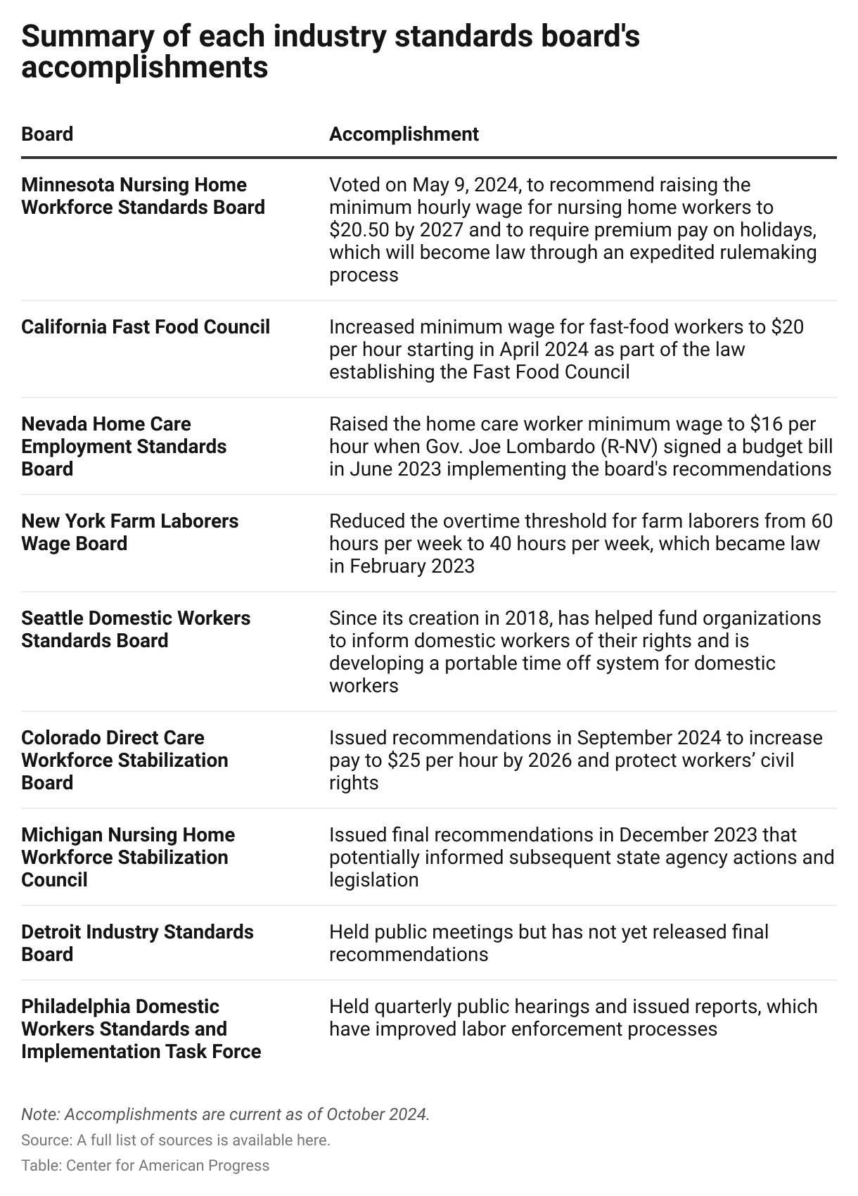 Case studies of the industry standards boards and similar bodies in California, Colorado, Michigan, Minnesota, New York, and Nevada, as well as in Seattle, Detroit, and Philadelphia, highlight that these bodies have succeeded at raising standards, providing a forum to discuss industry-related issues, and increasing worker voice.