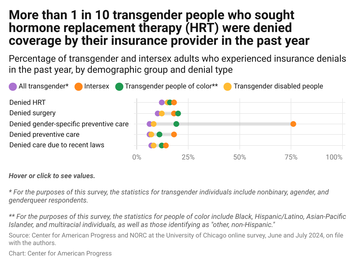 Discrimination by insurance providers also remains a significant problem for LGBTQI+ people. Recent surveys of health care providers in 2024 and 2023 show that insurance denials and coverage difficulties impede their ability to serve LGBTQI+ patients. In fact, CAP survey data show that 12 percent of transgender adults were denied insurance coverage for their hormone replacement therapy (HRT) prescriptions and 10 percent were denied coverage for gender-affirming surgeries.