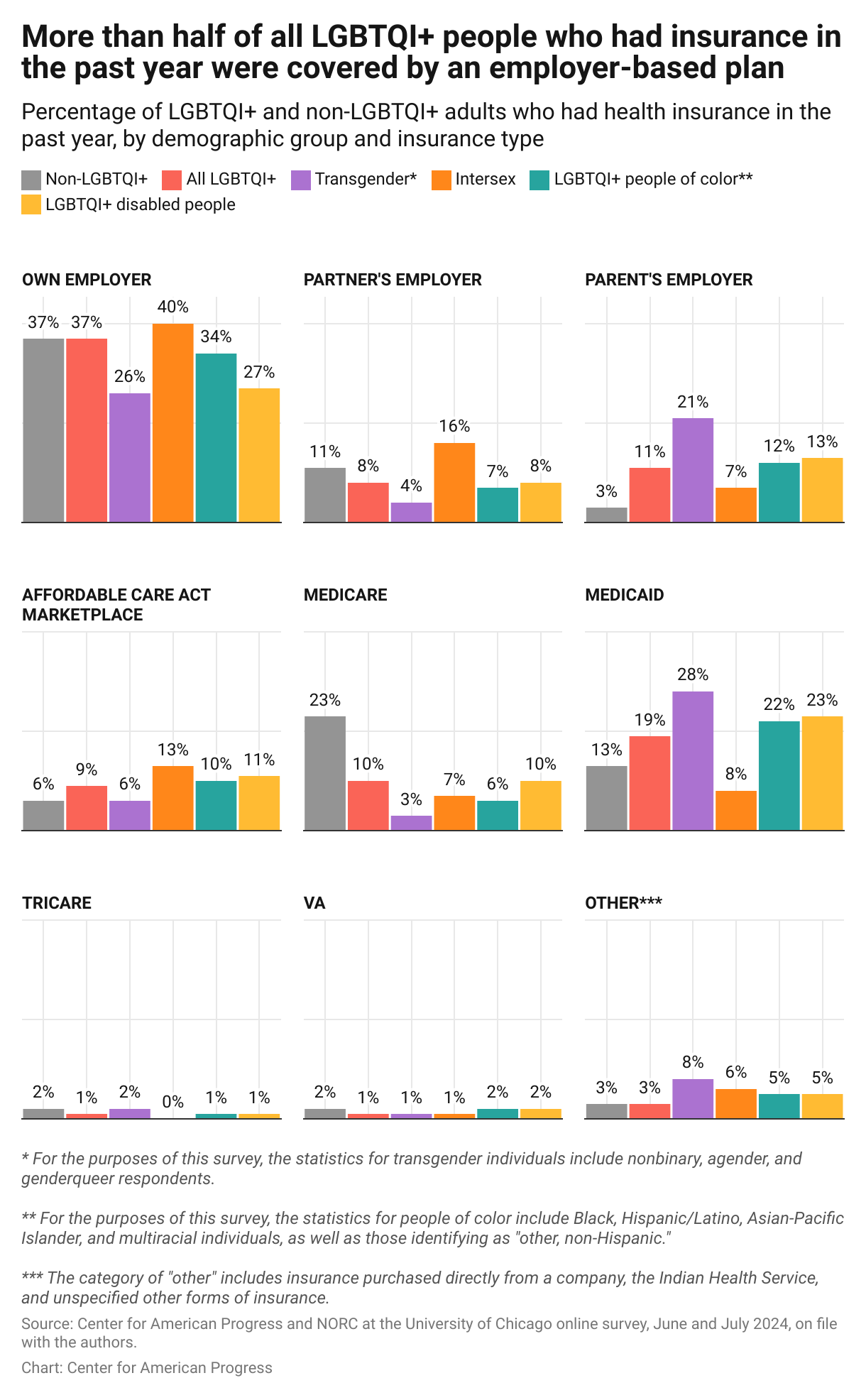 LGBTQI+ and non-LGBTQI+ people have employer-based coverage at the same rates. However, only 26 percent of transgender adults have such coverage through their own employer, compared with 37 percent of non-LGBTQI+ adults. Due to factors such as decreasing stigma and better protections against discrimination, people who are out as LGBTQI+ are more likely to be young and unmarried, which may be at least one reason for this gap in coverage. For example, by expanding dependents’ coverage through the age of 26, the ACA uniquely improved insurance coverage for young adults in same-sex couples. These numbers demonstrate that more LGBTQI+ people must rely on others to maintain insurance coverage.