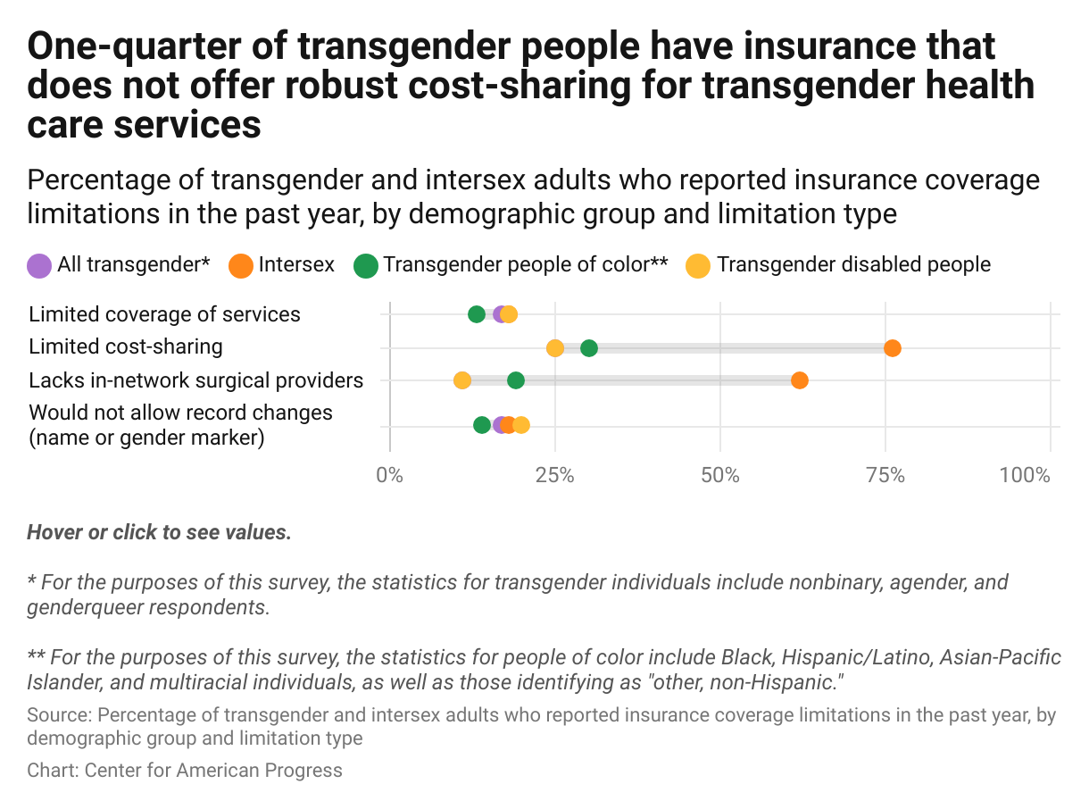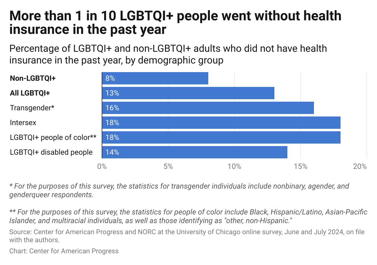 Even though more LGBTQI+ people have insurance coverage today, they still face difficulties accessing health care. For example, more than 1 in 10 transgender people reported that even though their insurance covered surgical care, there were no available surgeons in network. And a quarter of transgender people had insurance with low or limited cost-sharing for transgender health care.