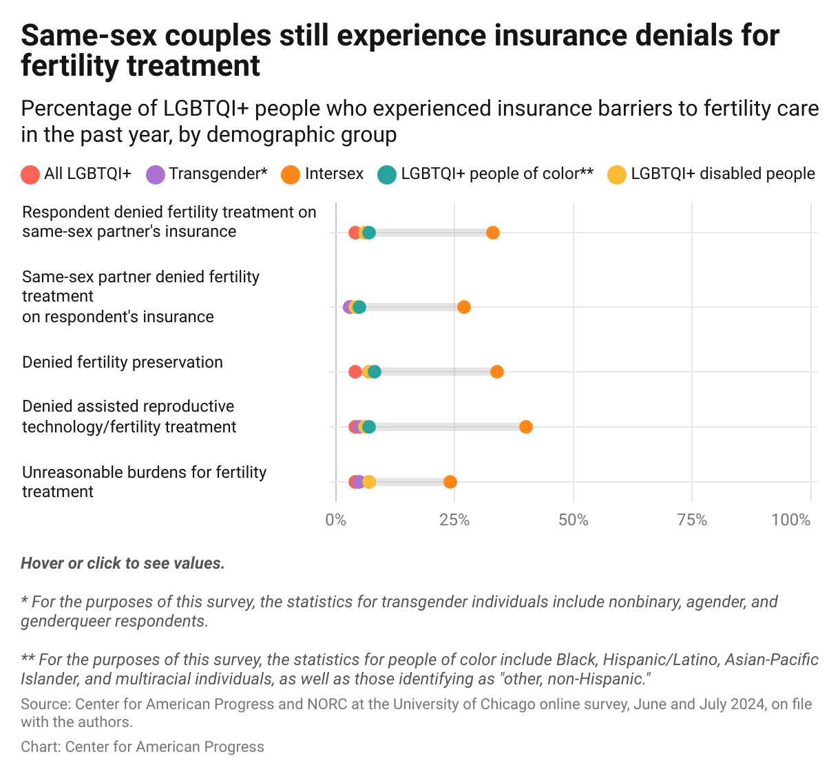 Improved nondiscrimination policies—which are now under threat thanks to the Trump administration—and changes in the definition of infertility should have improved coverage rates for same-sex couples. But unfortunately, insurance denial numbers are not widely available, so patients and policy advocates are often left in the dark. According to CAP survey data, 4 percent of all LGBTQI+ adults were denied coverage in 2024 or faced burdensome requirements to receive coverage. Notably, denial rates are statistically significantly higher for LGBTQI+ adults of color compared with white LGBTQI+ adults: In 2024, 8 percent of LGBTQI+ adults of color were denied fertility preservation and 7 percent were denied fertility treatments—compared with 3 percent and 4 percent, respectively, for white LGBTQI+ adults.