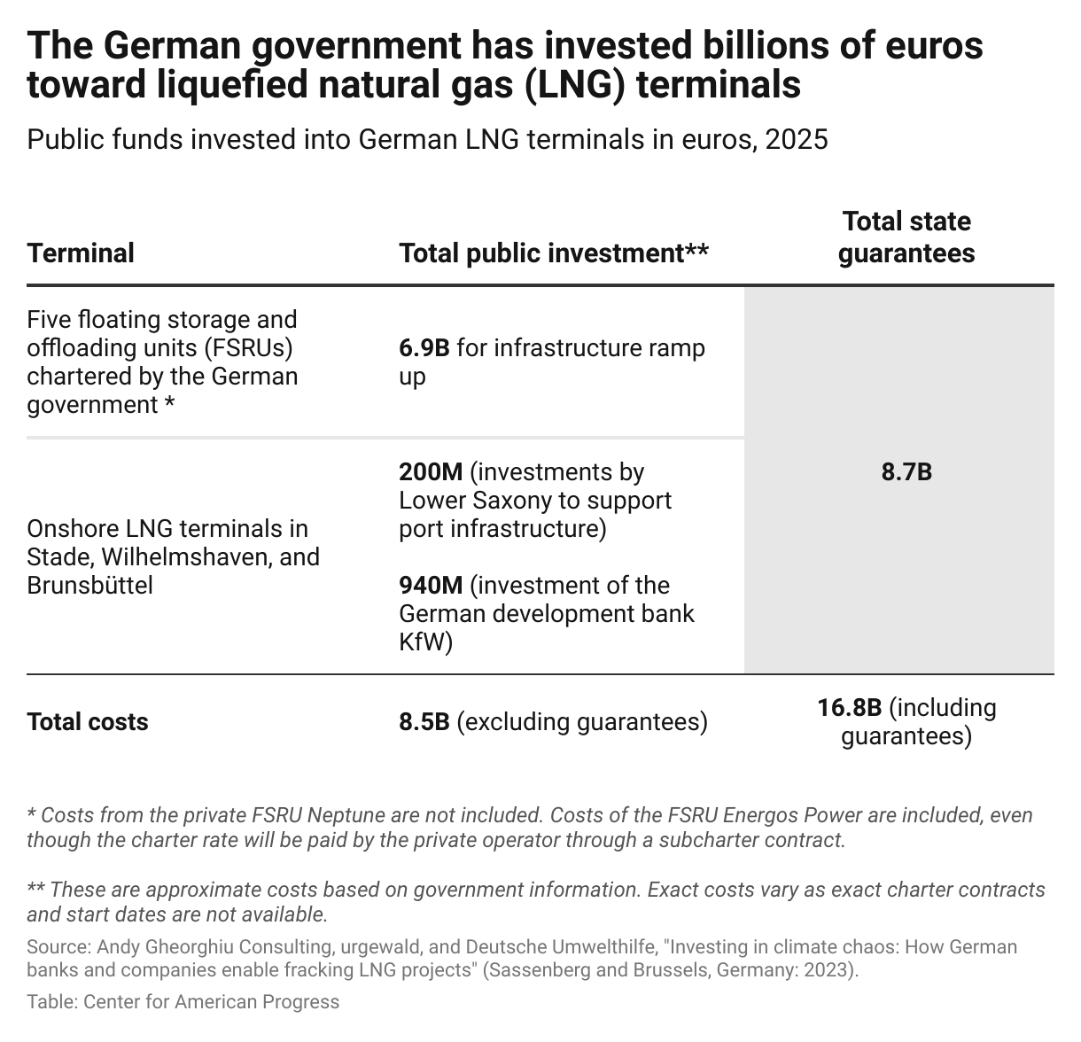 Even as large as these public expenditures are, returns on these investments cannot be guaranteed. For example, public investment in the infrastructure-related site costs for the FSRU terminals amounts to about 6.9 billion euros—excluding any income generated from the federal government subchartering to private operators or from the sale of pipeline pipes to private operators.80 However, some of the assumed revenues from the FSRU terminals have already failed to materialize, due to cost overruns and project delays, lower-than-expected demand, and competition from other energy sources. For example, the subchartering of the FSRU in the Baltic Sea did not work out due to the private operator reneging on the contract.81 These risks result in additional costs to the public: The state guarantees at least 8.7 billion euros that can be drawn on to compensate operators for shortfalls in expected revenues, as well as several million in state investments for the construction of onshore LNG terminals.82