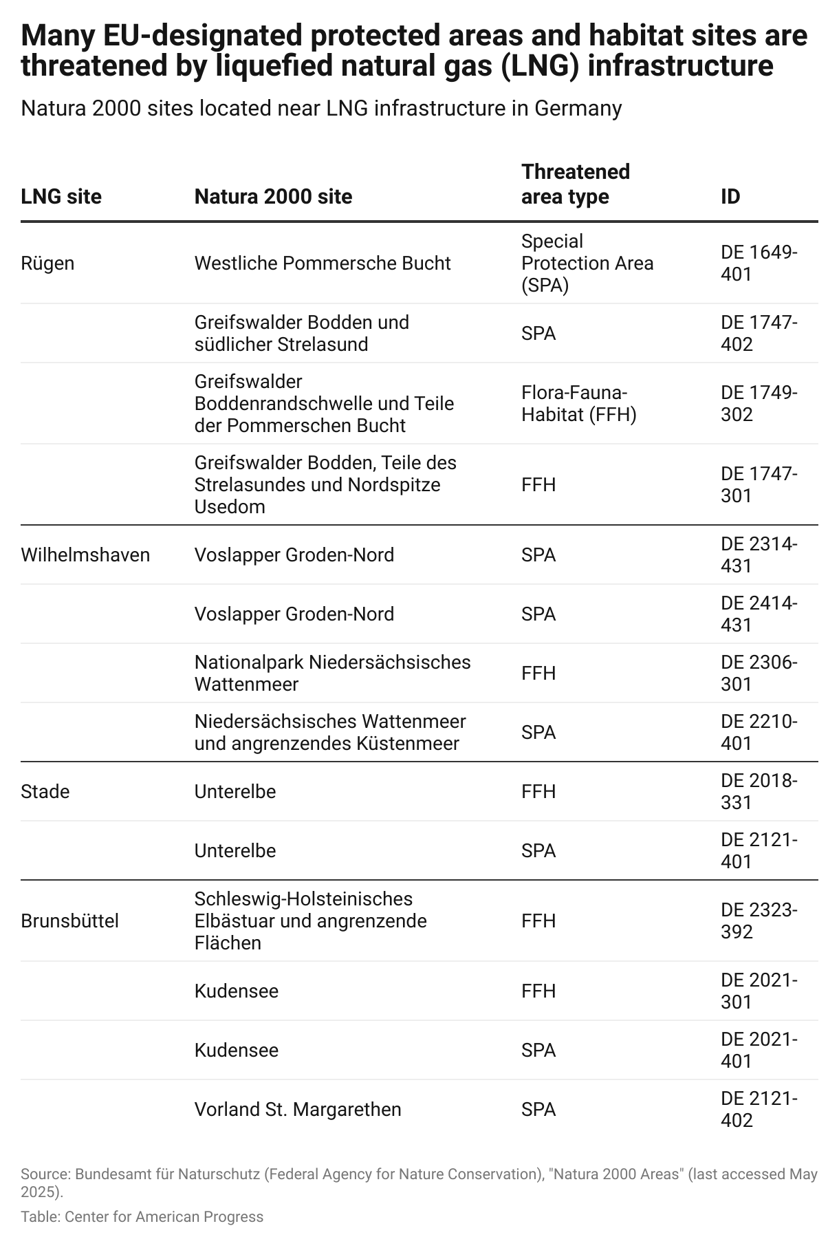 The LNG Acceleration Act enables FSRUs, as well as connecting pipelines for terminals, to be built without environmental impact assessments.103 This LNG infrastructure and the increased shipping traffic pose significant threats to several Natura 2000 sites designated to conserve nature and biodiversity, as well as other protected areas. In Germany, a total of 14 Natura 2000 sites are affected by LNG infrastructure, including eight special protection areas (SPAs) for birds and six flora-fauna-habitat (FFH) sites. The construction of LNG terminals and pipelines leads to habitat destruction and fragmentation, encroaching on protected ecosystems and displacing wildlife. Large-scale construction activities disturb sensitive species, altering their natural behavior and movement patterns.104
