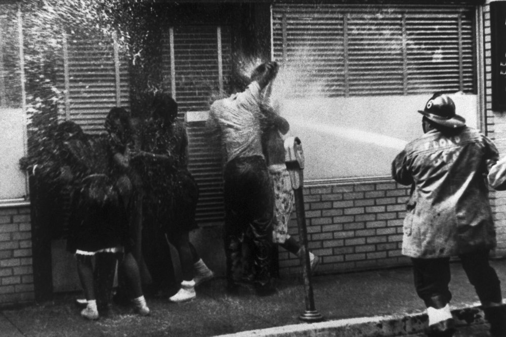 Firemen bear in on a group of African Americans who sought shelter in a doorway as hoses and dogs were used in routing antisegregation demonstrators in Birmingham, Alabama, on May 3, 1963. (Getty)