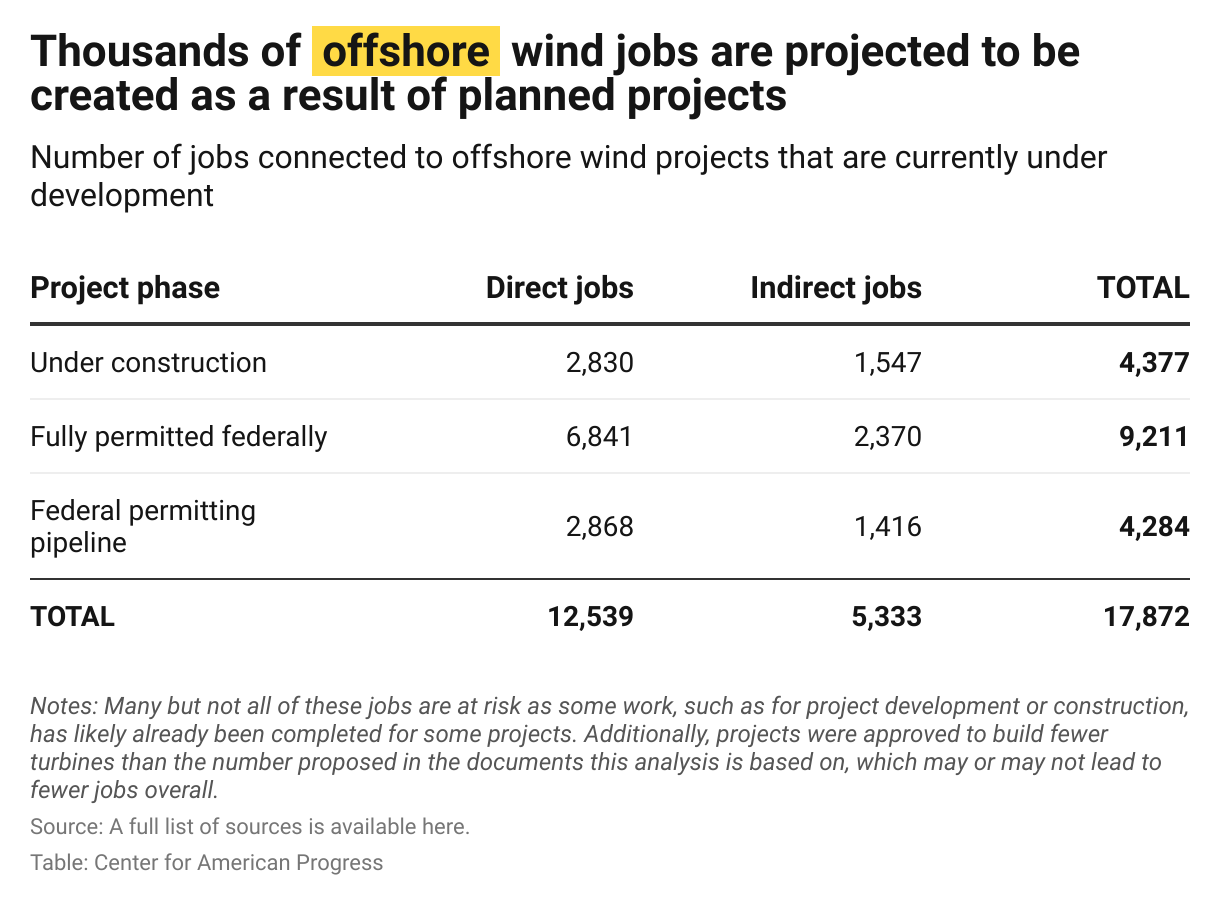 According to a new CAP analysis, more than 17,000 jobs in the offshore wind industry are tied to about a dozen projects that have been paused or are at risk of being paused due to the Trump administration’s executive orders attacking wind power. These projects are connected to more than 12,000 direct jobs and 5,000 indirect jobs, and more than 75 percent of these jobs combined are connected to projects that have all their federal permits or are under construction. In the offshore wind sector alone, more than 10,000 union jobs are at risk because of the Trump administration’s attacks.33 In this report, a direct job is defined as one related to the installation or operation of wind energy technology, and an indirect job is defined as one related to supply chain requirements. Many of those jobs, whether part of the supply chain or working on a project itself, will not materialize unless the temporary ban is lifted and may never materialize if the temporary ban lasts too long or if the project loses eligibility for tax credits.