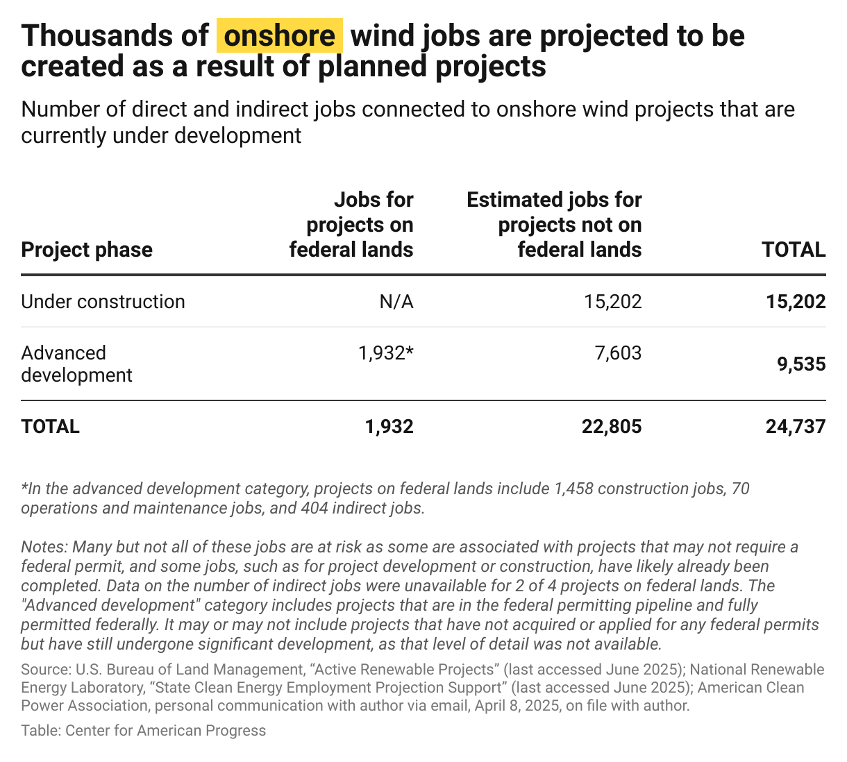 These actions will have a direct effect on jobs. According to a new analysis from the Center for American Progress, more than 17,000 jobs are connected to offshore wind power projects that are already canceled, on hold, or at risk from the Trump administration’s attacks on wind power. A subset of these projects are also at risk of losing funding because of the OBBBA. Thousands more could be at risk in the onshore wind industry.