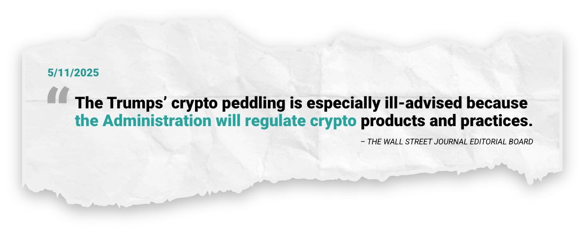Who buys this stuff? These crypto schemes open up many opportunities for corruption. Honest Americans can easily wonder: If a foreign company wanted a lawsuit dropped or a foreign country wanted tariff relief, would they simply need to buy enough meme coins? If a criminal were looking for a pardon, would they just need to purchase secret digital tokens? A September report from Accountable.US showed tokens from one of the Trump family’s crypto ventures were “sold to a variety of highly suspicious entities that appear to have connections to North Korea, Iran and Russia, as well as known money-laundering platform Tornado Cash.” The possibilities, and the consequences for the American people, are endless. There is plenty we still don’t know, but what we know now is already concerning.